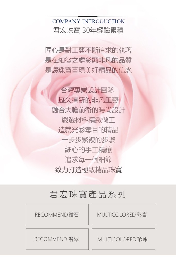 本店翡翠皆為100%天然翡翠A貨,品質嚴選,從挑選到精鑲皆為君宏珠寶獨家設計製做。